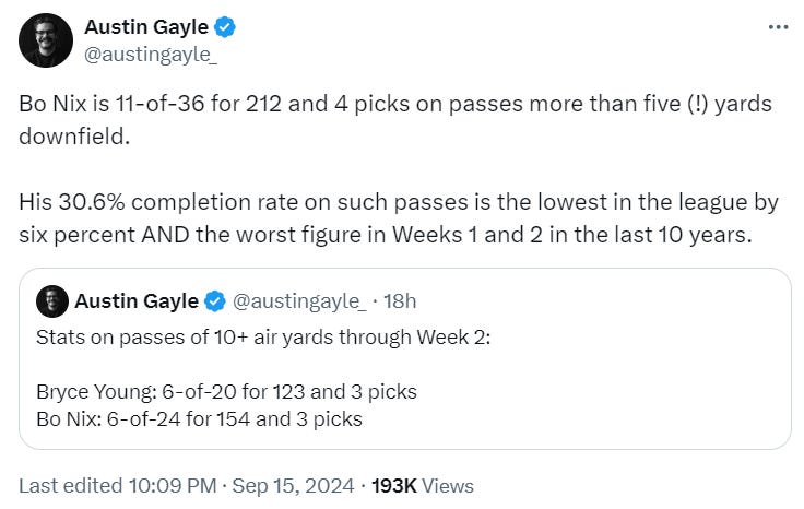 After being touted as the Broncos’ savior because of a good preseason (when will they learn?), Bo Nix has struggled with downfield accuracy and has made several flat-out poor decisions to start his rookie season. He was just 2-for-12 with two interceptions in Week 2 when throwing further than 10 yards, including this brutal pick in the end zone: